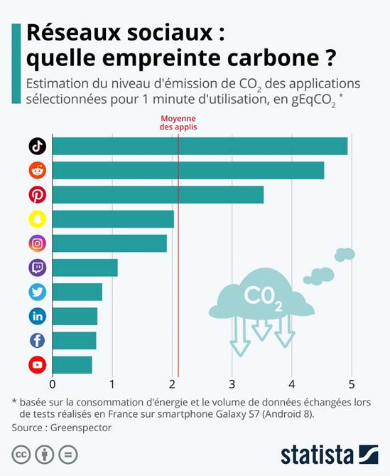 L’image ci-dessous témoigne qu’une minute d’utilisation d’une application n’a pas le même impact carbone que celui d’une autre application. Explorons dans cet article l’impact carbone des sites web et des applications, ses causes et les moyens de le réduire.